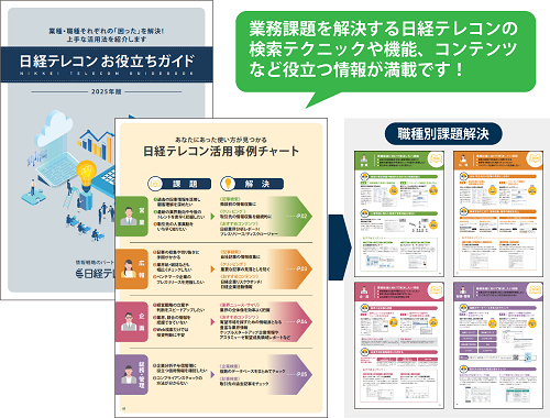 「情報収集に時間がかかりすぎる」「競合や業界の動向が把握できていない」――多忙なビジネスパーソンの悩みを軽減し、情報戦略を次のレベルへ引き上げる「日経テレコン お役立ちガイド」2025年版のご案内です。本ガイドでは、日経テレコンの豊富なコンテンツと機能を活用し、職種ごとの具体的な課題を打開する方法を紹介しています。