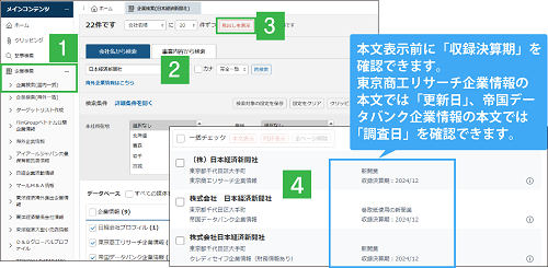 「企業情報」メニューでは、複数の調査機関による最新で信頼性の高い企業データを比較できるため、客観的で正確な従業員数を把握できます。法令遵守に不可欠な取引先の客観的な裏付け情報として、貴社の業務を強力にサポートします。