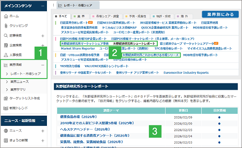 - メインコンテンツから「業界情報」のサブメニュー「レポート・市場シェア」をクリック
