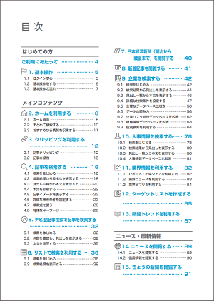「日経テレコン 操作ガイド」は、日々更新される日経テレコンのメニューやコンテンツを網羅し、その操作方法を紹介している資料です。目次から体系的に必要な操作方法をたどることができるため、「日経テレコンの全体像を把握したい」「使い方を知りたい」「活用法がわからない」といった場合に役立ちます。